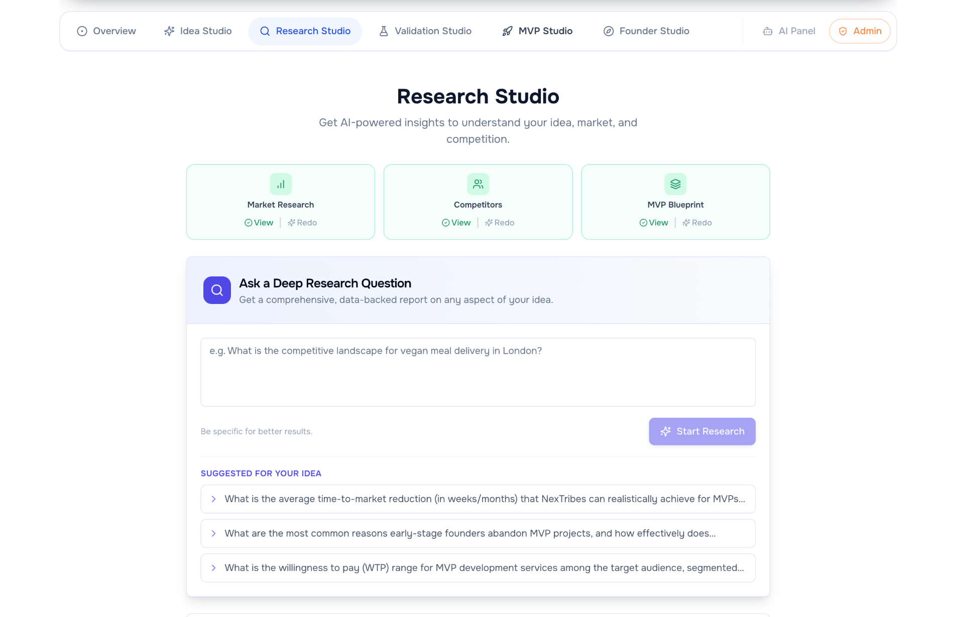 NexTribes pulls in your idea context, market, competitors, platform, and stage, then builds a full research report around that single question.
